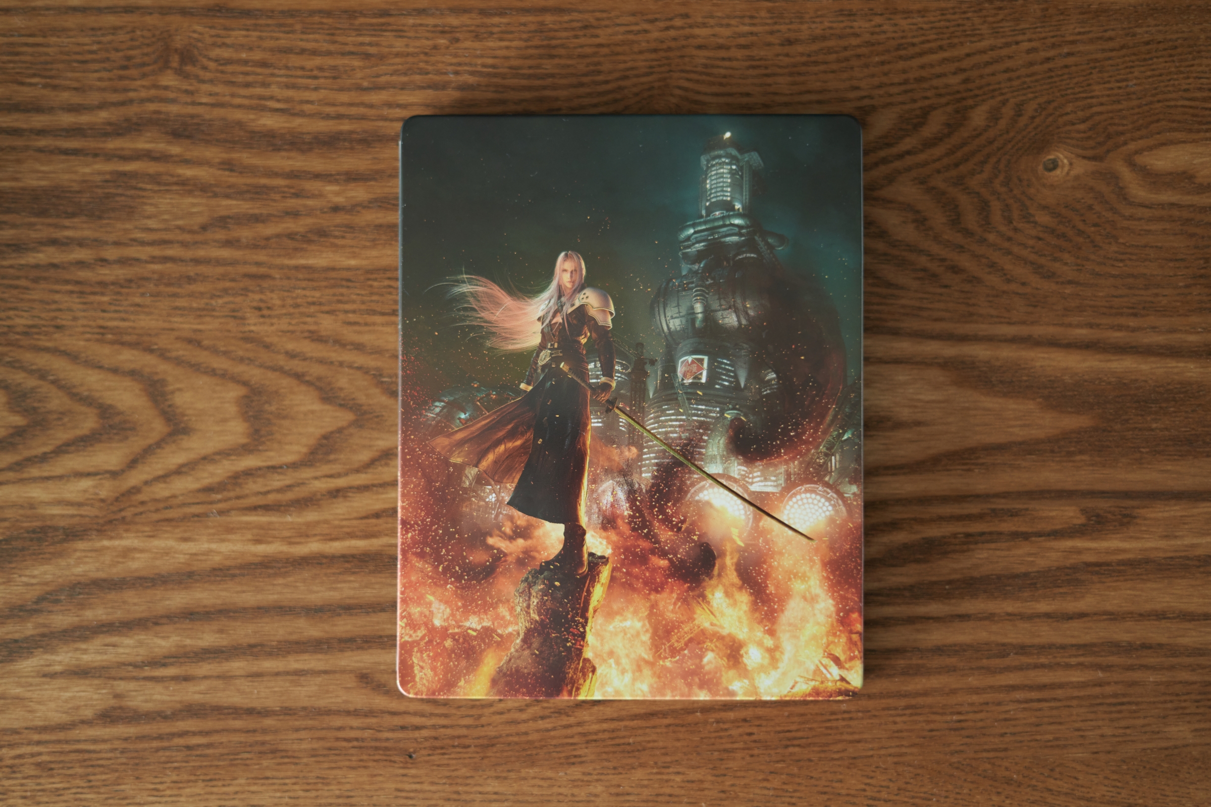 스틸북 케이스입니다. 의외로 주인공인 클라우드가 아니라 빌런인 세피로스가 앞면을 당당히 차지했습니다. 뒷면은 검은 배경에 로고가 있는 심플한 배경인데, 이쪽이 조금 더 마음에 듭니다. 클라우드, 바레트, 티파, 에어리스 등 주인공들이 한 쪽에 있었어도 괜찮았을 것 같네요.